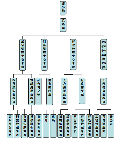 公司按照現(xiàn)代企業(yè)管理模式,建立了科學(xué)高效的組織機(jī)構(gòu),現(xiàn)設(shè)“一辦一部四中心”,分別為總經(jīng)辦、綜合部、工程管理中心、人力資源管理中心、經(jīng)營(yíng)管理中心、財(cái)務(wù)管理中心。